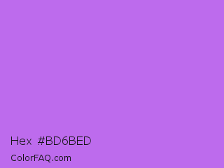 Hex #bd6bed Color is a light purple color and the nearest color is Lavender #b57edc. Hex code #bd6bed and RGB value is rgb(189,107,237). In RGB color space, this color is composed of 74% red, 42% green, 93% blue, In CMYK color space, this color is composed of 20% cyan, 55% magenta, 0% yellow , 7% black , In HSL color space, this color has a hue angle of 278° , 78% saturation and 67% lightness.