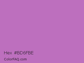 Hex #bd6fbe Color is a normal magenta color and the nearest color is Rich Lilac #b666d2. Hex code #bd6fbe and RGB value is rgb(189,111,190). In RGB color space, this color is composed of 74% red, 44% green, 75% blue, In CMYK color space, this color is composed of 1% cyan, 42% magenta, 0% yellow , 25% black , In HSL color space, this color has a hue angle of 299° , 38% saturation and 59% lightness.
