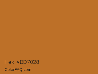 Hex #bd7028 Color is a normal orange color and the nearest color is Liver Dogs #b86d29. Hex code #bd7028 and RGB value is rgb(189,112,40). In RGB color space, this color is composed of 74% red, 44% green, 16% blue, In CMYK color space, this color is composed of 0% cyan, 41% magenta, 79% yellow , 26% black , In HSL color space, this color has a hue angle of 29° , 65% saturation and 45% lightness.
