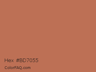 Hex #bd7055 Color is a normal orange color and the nearest color is Santa Fe #b16d52. Hex code #bd7055 and RGB value is rgb(189,112,85). In RGB color space, this color is composed of 74% red, 44% green, 33% blue, In CMYK color space, this color is composed of 0% cyan, 41% magenta, 55% yellow , 26% black , In HSL color space, this color has a hue angle of 16° , 44% saturation and 54% lightness.