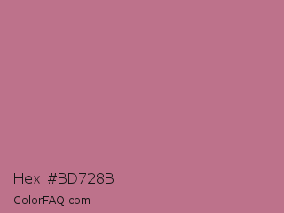 Hex #bd728b Color is a normal rose color and the nearest color is Turkish Rose #b57281. Hex code #bd728b and RGB value is rgb(189,114,139). In RGB color space, this color is composed of 74% red, 45% green, 55% blue, In CMYK color space, this color is composed of 0% cyan, 40% magenta, 26% yellow , 26% black , In HSL color space, this color has a hue angle of 340° , 36% saturation and 59% lightness.