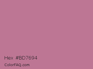 Hex #bd7694 Color is a normal rose color and the nearest color is English Lavender #b48395. Hex code #bd7694 and RGB value is rgb(189,118,148). In RGB color space, this color is composed of 74% red, 46% green, 58% blue, In CMYK color space, this color is composed of 0% cyan, 38% magenta, 22% yellow , 26% black , In HSL color space, this color has a hue angle of 335° , 35% saturation and 60% lightness.