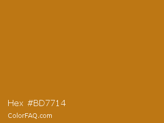 Hex #bd7714 Color is a normal orange color and the nearest color is Bourbon #ba6f1e. Hex code #bd7714 and RGB value is rgb(189,119,20). In RGB color space, this color is composed of 74% red, 47% green, 8% blue, In CMYK color space, this color is composed of 0% cyan, 37% magenta, 89% yellow , 26% black , In HSL color space, this color has a hue angle of 35° , 81% saturation and 41% lightness.