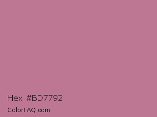 Hex #bd7792 Color is a normal rose color and the nearest color is English Lavender #b48395. Hex code #bd7792 and RGB value is rgb(189,119,146). In RGB color space, this color is composed of 74% red, 47% green, 57% blue, In CMYK color space, this color is composed of 0% cyan, 37% magenta, 23% yellow , 26% black , In HSL color space, this color has a hue angle of 337° , 35% saturation and 60% lightness.