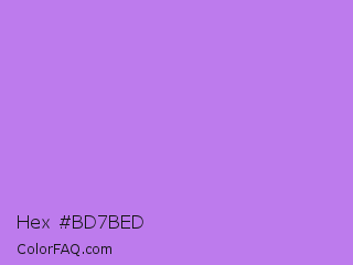 Hex #bd7bed Color is a light purple color and the nearest color is Lavender #b57edc. Hex code #bd7bed and RGB value is rgb(189,123,237). In RGB color space, this color is composed of 74% red, 48% green, 93% blue, In CMYK color space, this color is composed of 20% cyan, 48% magenta, 0% yellow , 7% black , In HSL color space, this color has a hue angle of 275° , 76% saturation and 71% lightness.