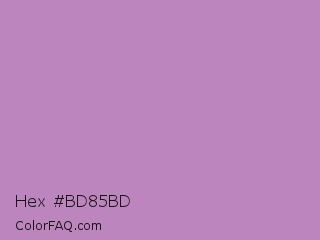 Hex #bd85bd Color is a light magenta color and the nearest color is African Violet #b284be. Hex code #bd85bd and RGB value is rgb(189,133,189). In RGB color space, this color is composed of 74% red, 52% green, 74% blue, In CMYK color space, this color is composed of 0% cyan, 30% magenta, 0% yellow , 26% black , In HSL color space, this color has a hue angle of 300° , 30% saturation and 63% lightness.