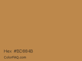 Hex #bd884b Color is a normal orange color and the nearest color is Deer #ba8759. Hex code #bd884b and RGB value is rgb(189,136,75). In RGB color space, this color is composed of 74% red, 53% green, 29% blue, In CMYK color space, this color is composed of 0% cyan, 28% magenta, 60% yellow , 26% black , In HSL color space, this color has a hue angle of 32° , 46% saturation and 52% lightness.