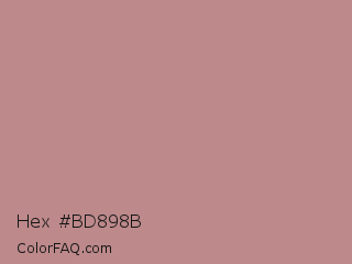 Hex #bd898b Color is a light red color and the nearest color is Rosy Brown #bc8f8f. Hex code #bd898b and RGB value is rgb(189,137,139). In RGB color space, this color is composed of 74% red, 54% green, 55% blue, In CMYK color space, this color is composed of 0% cyan, 28% magenta, 26% yellow , 26% black , In HSL color space, this color has a hue angle of 358° , 28% saturation and 64% lightness.