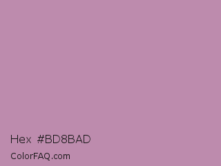 Hex #bd8bad Color is a light magenta color and the nearest color is Opera Mauve #b784a7. Hex code #bd8bad and RGB value is rgb(189,139,173). In RGB color space, this color is composed of 74% red, 55% green, 68% blue, In CMYK color space, this color is composed of 0% cyan, 26% magenta, 8% yellow , 26% black , In HSL color space, this color has a hue angle of 319° , 27% saturation and 64% lightness.