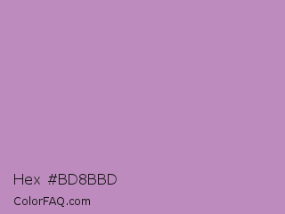 Hex #bd8bbd Color is a light magenta color and the nearest color is African Violet #b284be. Hex code #bd8bbd and RGB value is rgb(189,139,189). In RGB color space, this color is composed of 74% red, 55% green, 74% blue, In CMYK color space, this color is composed of 0% cyan, 26% magenta, 0% yellow , 26% black , In HSL color space, this color has a hue angle of 300° , 27% saturation and 64% lightness.