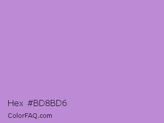 Hex #bd8bd6 Color is a light purple color and the nearest color is Lavender #b57edc. Hex code #bd8bd6 and RGB value is rgb(189,139,214). In RGB color space, this color is composed of 74% red, 55% green, 84% blue, In CMYK color space, this color is composed of 12% cyan, 35% magenta, 0% yellow , 16% black , In HSL color space, this color has a hue angle of 280° , 48% saturation and 69% lightness.