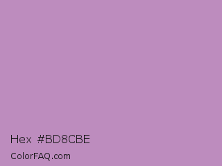 Hex #bd8cbe Color is a light magenta color and the nearest color is African Violet #b284be. Hex code #bd8cbe and RGB value is rgb(189,140,190). In RGB color space, this color is composed of 74% red, 55% green, 75% blue, In CMYK color space, this color is composed of 1% cyan, 26% magenta, 0% yellow , 25% black , In HSL color space, this color has a hue angle of 299° , 28% saturation and 65% lightness.