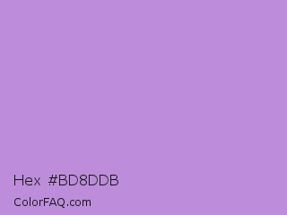 Hex #bd8ddb Color is a light purple color and the nearest color is Bright Lavender #bf94e4. Hex code #bd8ddb and RGB value is rgb(189,141,219). In RGB color space, this color is composed of 74% red, 55% green, 86% blue, In CMYK color space, this color is composed of 14% cyan, 36% magenta, 0% yellow , 14% black , In HSL color space, this color has a hue angle of 277° , 52% saturation and 71% lightness.