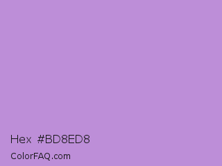Hex #bd8ed8 Color is a light purple color and the nearest color is Bright Lavender #bf94e4. Hex code #bd8ed8 and RGB value is rgb(189,142,216). In RGB color space, this color is composed of 74% red, 56% green, 85% blue, In CMYK color space, this color is composed of 13% cyan, 34% magenta, 0% yellow , 15% black , In HSL color space, this color has a hue angle of 278° , 49% saturation and 70% lightness.