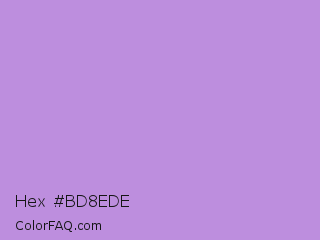 Hex #bd8ede Color is a light purple color and the nearest color is Bright Lavender #bf94e4. Hex code #bd8ede and RGB value is rgb(189,142,222). In RGB color space, this color is composed of 74% red, 56% green, 87% blue, In CMYK color space, this color is composed of 15% cyan, 36% magenta, 0% yellow , 13% black , In HSL color space, this color has a hue angle of 275° , 55% saturation and 71% lightness.