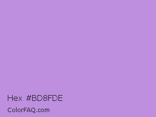 Hex #bd8fde Color is a light purple color and the nearest color is Bright Lavender #bf94e4. Hex code #bd8fde and RGB value is rgb(189,143,222). In RGB color space, this color is composed of 74% red, 56% green, 87% blue, In CMYK color space, this color is composed of 15% cyan, 36% magenta, 0% yellow , 13% black , In HSL color space, this color has a hue angle of 275° , 54% saturation and 72% lightness.
