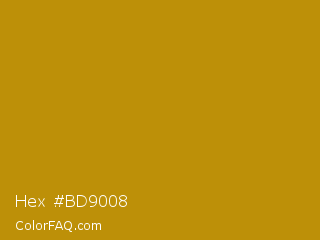 Hex #bd9008 Color is a normal orange color and the nearest color is Dark Goldenrod #b8860b. Hex code #bd9008 and RGB value is rgb(189,144,8). In RGB color space, this color is composed of 74% red, 56% green, 3% blue, In CMYK color space, this color is composed of 0% cyan, 24% magenta, 96% yellow , 26% black , In HSL color space, this color has a hue angle of 45° , 92% saturation and 39% lightness.