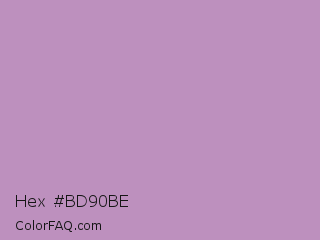 Hex #bd90be Color is a light magenta color and the nearest color is African Violet #b284be. Hex code #bd90be and RGB value is rgb(189,144,190). In RGB color space, this color is composed of 74% red, 56% green, 75% blue, In CMYK color space, this color is composed of 1% cyan, 24% magenta, 0% yellow , 25% black , In HSL color space, this color has a hue angle of 299° , 26% saturation and 65% lightness.