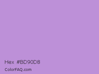 Hex #bd90d8 Color is a light purple color and the nearest color is Bright Lavender #bf94e4. Hex code #bd90d8 and RGB value is rgb(189,144,216). In RGB color space, this color is composed of 74% red, 56% green, 85% blue, In CMYK color space, this color is composed of 13% cyan, 33% magenta, 0% yellow , 15% black , In HSL color space, this color has a hue angle of 278° , 48% saturation and 71% lightness.