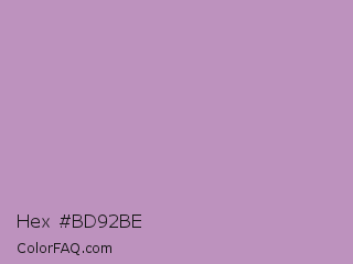 Hex #bd92be Color is a light magenta color and the nearest color is African Violet #b284be. Hex code #bd92be and RGB value is rgb(189,146,190). In RGB color space, this color is composed of 74% red, 57% green, 75% blue, In CMYK color space, this color is composed of 1% cyan, 23% magenta, 0% yellow , 25% black , In HSL color space, this color has a hue angle of 299° , 25% saturation and 66% lightness.