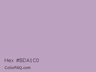 Hex #bda1c0 Color is a light magenta color and the nearest color is London Hue #bea6c3. Hex code #bda1c0 and RGB value is rgb(189,161,192). In RGB color space, this color is composed of 74% red, 63% green, 75% blue, In CMYK color space, this color is composed of 2% cyan, 16% magenta, 0% yellow , 25% black , In HSL color space, this color has a hue angle of 294° , 20% saturation and 69% lightness.