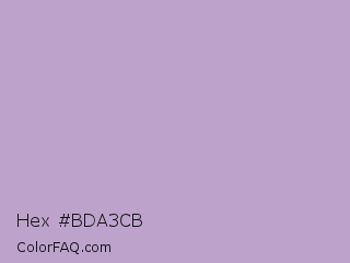 Hex #bda3cb Color is a light purple color and the nearest color is London Hue #bea6c3. Hex code #bda3cb and RGB value is rgb(189,163,203). In RGB color space, this color is composed of 74% red, 64% green, 80% blue, In CMYK color space, this color is composed of 7% cyan, 20% magenta, 0% yellow , 20% black , In HSL color space, this color has a hue angle of 279° , 28% saturation and 72% lightness.