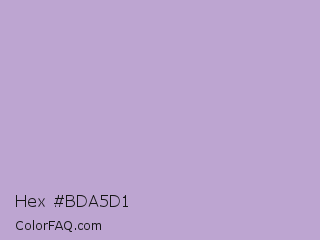 Hex #bda5d1 Color is a light purple color and the nearest color is London Hue #bea6c3. Hex code #bda5d1 and RGB value is rgb(189,165,209). In RGB color space, this color is composed of 74% red, 65% green, 82% blue, In CMYK color space, this color is composed of 10% cyan, 21% magenta, 0% yellow , 18% black , In HSL color space, this color has a hue angle of 273° , 32% saturation and 73% lightness.