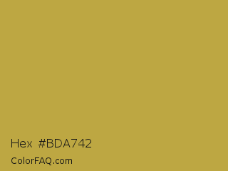 Hex #bda742 Color is a normal yellow color and the nearest color is Brass #b5a642. Hex code #bda742 and RGB value is rgb(189,167,66). In RGB color space, this color is composed of 74% red, 65% green, 26% blue, In CMYK color space, this color is composed of 0% cyan, 12% magenta, 65% yellow , 26% black , In HSL color space, this color has a hue angle of 49° , 48% saturation and 50% lightness.