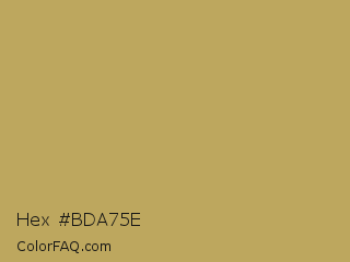 Hex #bda75e Color is a normal yellow color and the nearest color is Husk #b7a458. Hex code #bda75e and RGB value is rgb(189,167,94). In RGB color space, this color is composed of 74% red, 65% green, 37% blue, In CMYK color space, this color is composed of 0% cyan, 12% magenta, 50% yellow , 26% black , In HSL color space, this color has a hue angle of 46° , 42% saturation and 55% lightness.