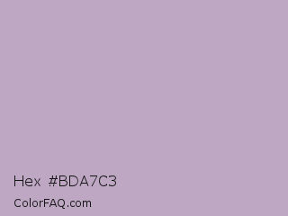Hex #bda7c3 Color is a light purple color and the nearest color is London Hue #bea6c3. Hex code #bda7c3 and RGB value is rgb(189,167,195). In RGB color space, this color is composed of 74% red, 65% green, 76% blue, In CMYK color space, this color is composed of 3% cyan, 14% magenta, 0% yellow , 24% black , In HSL color space, this color has a hue angle of 287° , 19% saturation and 71% lightness.
