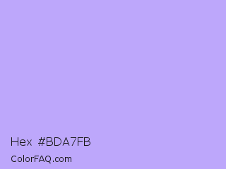 Hex #bda7fb Color is a very light indigo color and the nearest color is Pale Violet #cc99ff. Hex code #bda7fb and RGB value is rgb(189,167,251). In RGB color space, this color is composed of 74% red, 65% green, 98% blue, In CMYK color space, this color is composed of 25% cyan, 33% magenta, 0% yellow , 2% black , In HSL color space, this color has a hue angle of 256° , 91% saturation and 82% lightness.
