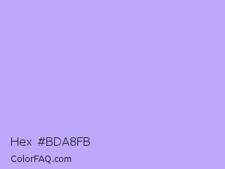 Hex #bda8fb Color is a very light indigo color and the nearest color is Biloba Flower #b2a1ea. Hex code #bda8fb and RGB value is rgb(189,168,251). In RGB color space, this color is composed of 74% red, 66% green, 98% blue, In CMYK color space, this color is composed of 25% cyan, 33% magenta, 0% yellow , 2% black , In HSL color space, this color has a hue angle of 255° , 91% saturation and 82% lightness.