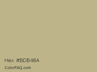 Hex #bdb48a Color is a light yellow color and the nearest color is Sage #bcb88a. Hex code #bdb48a and RGB value is rgb(189,180,138). In RGB color space, this color is composed of 74% red, 71% green, 54% blue, In CMYK color space, this color is composed of 0% cyan, 5% magenta, 27% yellow , 26% black , In HSL color space, this color has a hue angle of 49° , 28% saturation and 64% lightness.