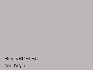 Hex #bdb6b6 Color is a light red color and the nearest color is Pink Swan #beb5b7. Hex code #bdb6b6 and RGB value is rgb(189,182,182). In RGB color space, this color is composed of 74% red, 71% green, 71% blue, In CMYK color space, this color is composed of 0% cyan, 4% magenta, 4% yellow , 26% black , In HSL color space, this color has a hue angle of 0° , 5% saturation and 73% lightness.