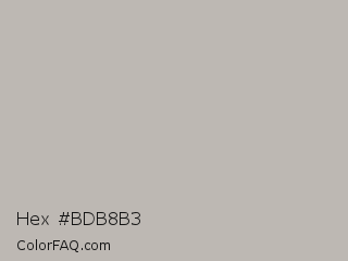 Hex #bdb8b3 Color is a light orange color and the nearest color is Tide #bfb8b0. Hex code #bdb8b3 and RGB value is rgb(189,184,179). In RGB color space, this color is composed of 74% red, 72% green, 70% blue, In CMYK color space, this color is composed of 0% cyan, 3% magenta, 5% yellow , 26% black , In HSL color space, this color has a hue angle of 30° , 7% saturation and 72% lightness.