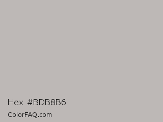 Hex #bdb8b6 Color is a light orange color and the nearest color is Pink Swan #beb5b7. Hex code #bdb8b6 and RGB value is rgb(189,184,182). In RGB color space, this color is composed of 74% red, 72% green, 71% blue, In CMYK color space, this color is composed of 0% cyan, 3% magenta, 4% yellow , 26% black , In HSL color space, this color has a hue angle of 17° , 5% saturation and 73% lightness.