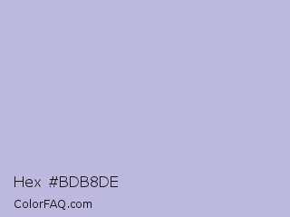 Hex #bdb8de Color is a light indigo color and the nearest color is Lavender Gray #bdbbd7. Hex code #bdb8de and RGB value is rgb(189,184,222). In RGB color space, this color is composed of 74% red, 72% green, 87% blue, In CMYK color space, this color is composed of 15% cyan, 17% magenta, 0% yellow , 13% black , In HSL color space, this color has a hue angle of 248° , 37% saturation and 80% lightness.