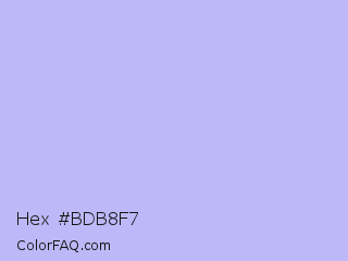 Hex #bdb8f7 Color is a very light indigo color and the nearest color is Melrose #c7c1ff. Hex code #bdb8f7 and RGB value is rgb(189,184,247). In RGB color space, this color is composed of 74% red, 72% green, 97% blue, In CMYK color space, this color is composed of 23% cyan, 26% magenta, 0% yellow , 3% black , In HSL color space, this color has a hue angle of 245° , 80% saturation and 85% lightness.