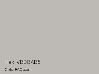 Hex #bdbab6 Color is a light orange color and the nearest color is Pink Swan #beb5b7. Hex code #bdbab6 and RGB value is rgb(189,186,182). In RGB color space, this color is composed of 74% red, 73% green, 71% blue, In CMYK color space, this color is composed of 0% cyan, 2% magenta, 4% yellow , 26% black , In HSL color space, this color has a hue angle of 34° , 5% saturation and 73% lightness.