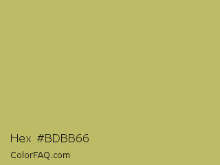 Hex #bdbb66 Color is a normal yellow color and the nearest color is Dark Khaki #bdb76b. Hex code #bdbb66 and RGB value is rgb(189,187,102). In RGB color space, this color is composed of 74% red, 73% green, 40% blue, In CMYK color space, this color is composed of 0% cyan, 1% magenta, 46% yellow , 26% black , In HSL color space, this color has a hue angle of 59° , 40% saturation and 57% lightness.