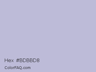 Hex #bdbbd8 Color is a light indigo color and the nearest color is Lavender Gray #bdbbd7. Hex code #bdbbd8 and RGB value is rgb(189,187,216). In RGB color space, this color is composed of 74% red, 73% green, 85% blue, In CMYK color space, this color is composed of 13% cyan, 13% magenta, 0% yellow , 15% black , In HSL color space, this color has a hue angle of 244° , 27% saturation and 79% lightness.