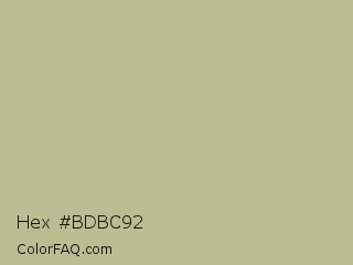 Hex #bdbc92 Color is a light yellow color and the nearest color is Sage #bcb88a. Hex code #bdbc92 and RGB value is rgb(189,188,146). In RGB color space, this color is composed of 74% red, 74% green, 57% blue, In CMYK color space, this color is composed of 0% cyan, 1% magenta, 23% yellow , 26% black , In HSL color space, this color has a hue angle of 59° , 25% saturation and 66% lightness.