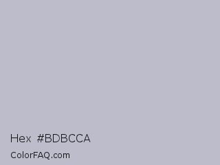 Hex #bdbcca Color is a light indigo color and the nearest color is French Gray #bdbdc6. Hex code #bdbcca and RGB value is rgb(189,188,202). In RGB color space, this color is composed of 74% red, 74% green, 79% blue, In CMYK color space, this color is composed of 6% cyan, 7% magenta, 0% yellow , 21% black , In HSL color space, this color has a hue angle of 244° , 12% saturation and 76% lightness.