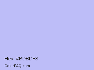Hex #bdbdf8 Color is a very light blue color and the nearest color is Melrose #c7c1ff. Hex code #bdbdf8 and RGB value is rgb(189,189,248). In RGB color space, this color is composed of 74% red, 74% green, 97% blue, In CMYK color space, this color is composed of 24% cyan, 24% magenta, 0% yellow , 3% black , In HSL color space, this color has a hue angle of 240° , 81% saturation and 86% lightness.