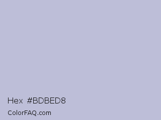 Hex #bdbed8 Color is a light blue color and the nearest color is Blue Haze #bfbed8. Hex code #bdbed8 and RGB value is rgb(189,190,216). In RGB color space, this color is composed of 74% red, 75% green, 85% blue, In CMYK color space, this color is composed of 13% cyan, 12% magenta, 0% yellow , 15% black , In HSL color space, this color has a hue angle of 238° , 26% saturation and 79% lightness.