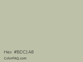 Hex #bdc1a8 Color is a light yellow color and the nearest color is Rainee #b9c8ac. Hex code #bdc1a8 and RGB value is rgb(189,193,168). In RGB color space, this color is composed of 74% red, 76% green, 66% blue, In CMYK color space, this color is composed of 2% cyan, 0% magenta, 13% yellow , 24% black , In HSL color space, this color has a hue angle of 70° , 17% saturation and 71% lightness.