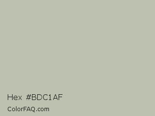 Hex #bdc1af Color is a light lime color and the nearest color is Green Spring #b8c1b1. Hex code #bdc1af and RGB value is rgb(189,193,175). In RGB color space, this color is composed of 74% red, 76% green, 69% blue, In CMYK color space, this color is composed of 2% cyan, 0% magenta, 9% yellow , 24% black , In HSL color space, this color has a hue angle of 73° , 13% saturation and 72% lightness.