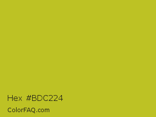 Hex #bdc224 Color is a normal yellow color and the nearest color is Key Lime Pie #bfc921. Hex code #bdc224 and RGB value is rgb(189,194,36). In RGB color space, this color is composed of 74% red, 76% green, 14% blue, In CMYK color space, this color is composed of 3% cyan, 0% magenta, 81% yellow , 24% black , In HSL color space, this color has a hue angle of 62° , 69% saturation and 45% lightness.