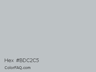 Hex #bdc2c5 Color is a light blue color and the nearest color is Silver Sand #bfc1c2. Hex code #bdc2c5 and RGB value is rgb(189,194,197). In RGB color space, this color is composed of 74% red, 76% green, 77% blue, In CMYK color space, this color is composed of 4% cyan, 2% magenta, 0% yellow , 23% black , In HSL color space, this color has a hue angle of 203° , 6% saturation and 76% lightness.