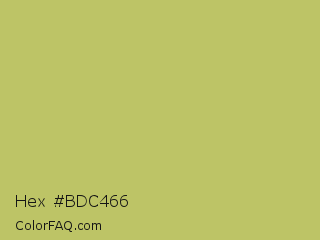 Hex #bdc466 Color is a normal yellow color and the nearest color is Wild Willow #b9c46a. Hex code #bdc466 and RGB value is rgb(189,196,102). In RGB color space, this color is composed of 74% red, 77% green, 40% blue, In CMYK color space, this color is composed of 4% cyan, 0% magenta, 48% yellow , 23% black , In HSL color space, this color has a hue angle of 64° , 44% saturation and 58% lightness.
